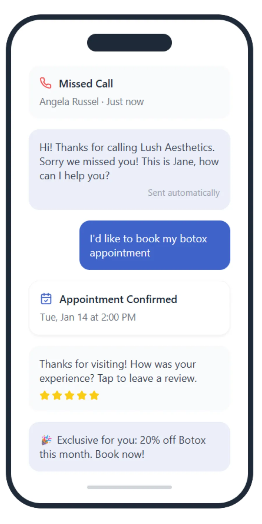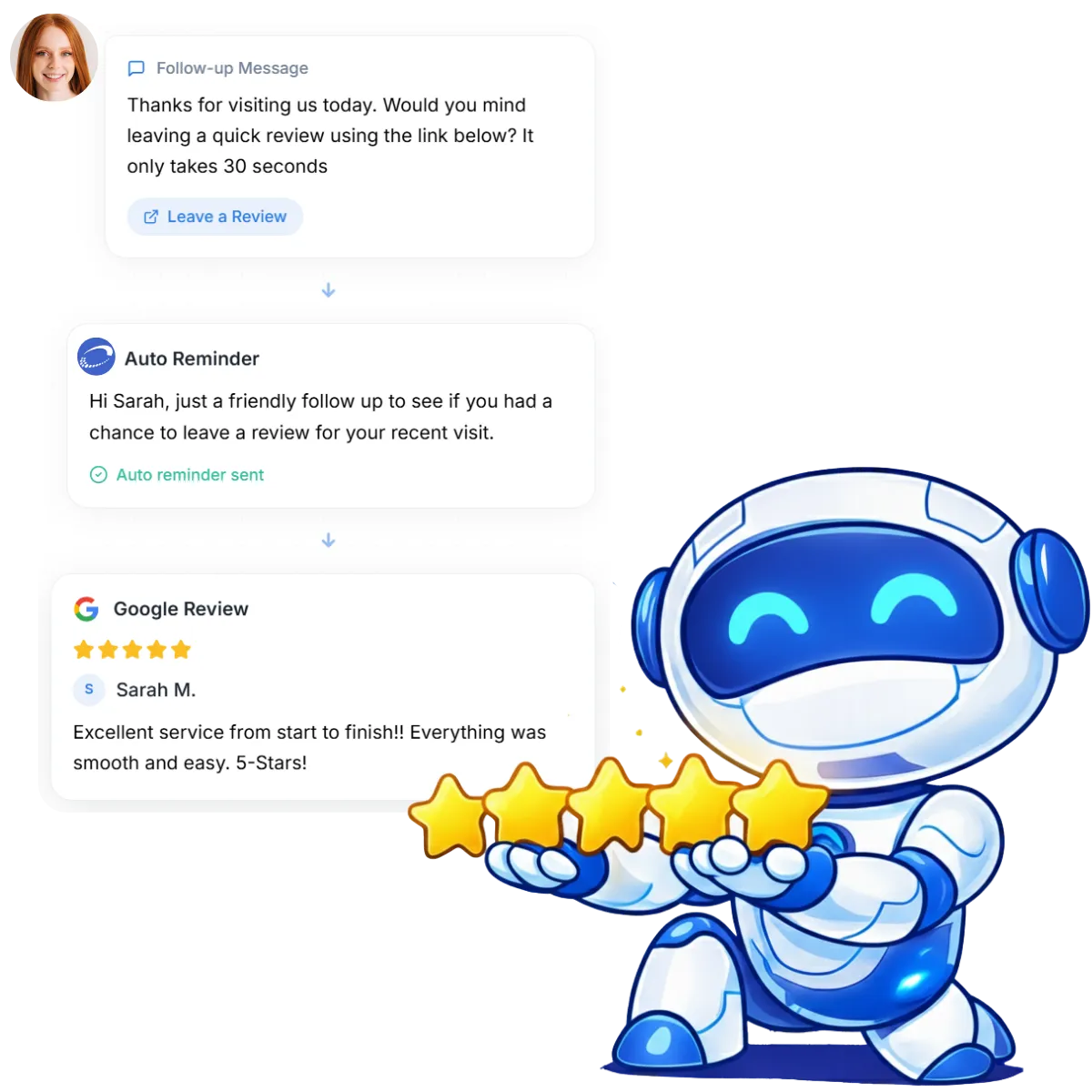 Turn missed calls into booked appointments, collect more 5-star reviews, and keep patients loyal with simple, automated follow-ups.